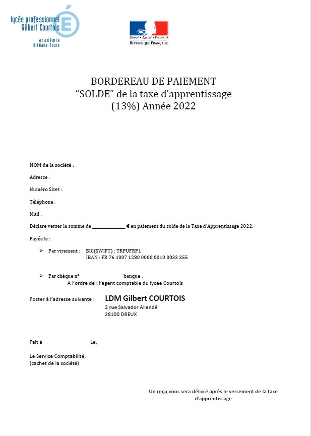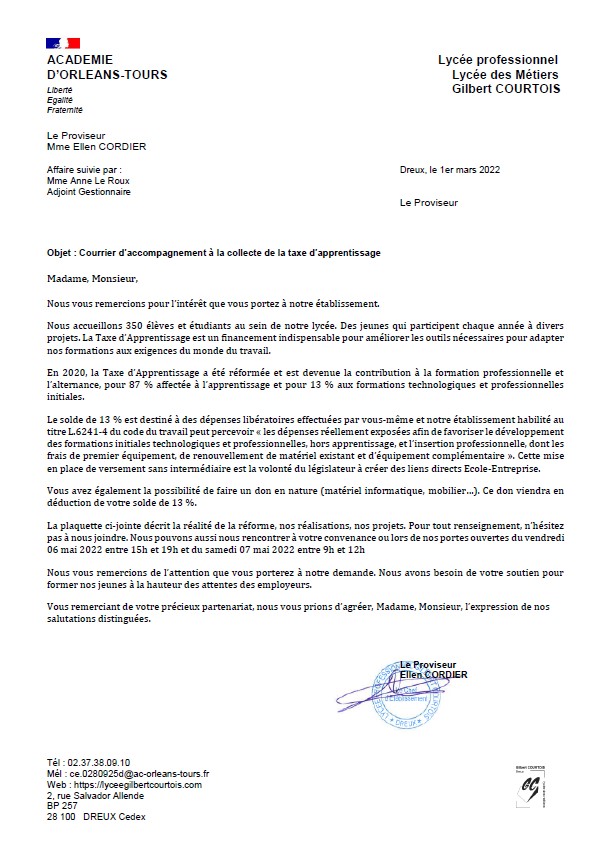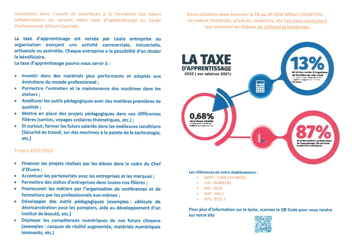 Cette collecte de la TA est très importante pour notre lycée, grâce à elle, nous pouvons financer et déployer des projets pédagogiques, des sorties en entreprises, acheter des matières premières, des équipements et des matériels qui seront utiles pour les enseignements professionnels et nos élèves. Documents à retrouver ICI